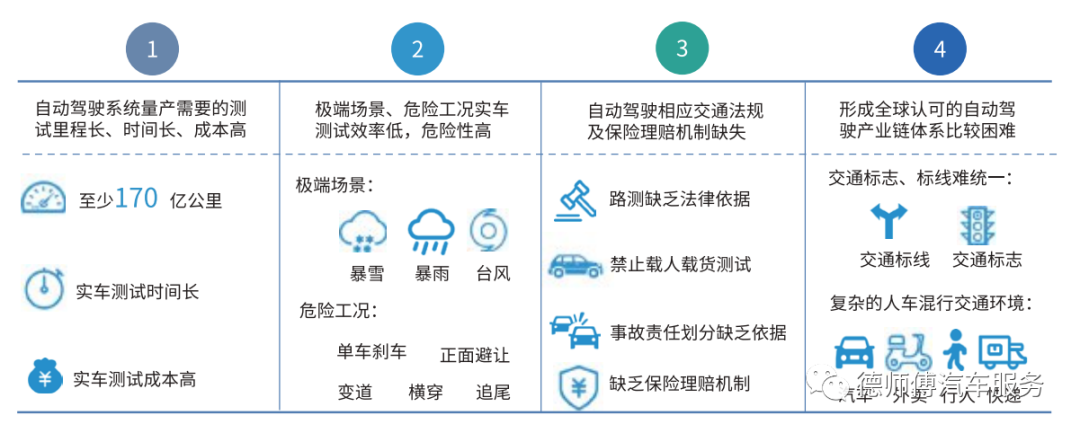自动驾驶汽车在真正商业化应用前,需要经历大量的道路测试才能达到商用要求。采用路测来优化自动驾驶算法耗费的时间和成本太高,且开放道路测试仍受到法规限制,极端交通条件和场景复现困难,测试安全存在隐患。世界各国交通环境也大相径庭,形成全球通用的产业链体系比较困难。以上种种问题使得自动驾驶产业链的全球化发展和技术交流面临众多实际问题。因此,基于场景库的仿真测试是解决自动驾驶研发测试挑战的主要路线。