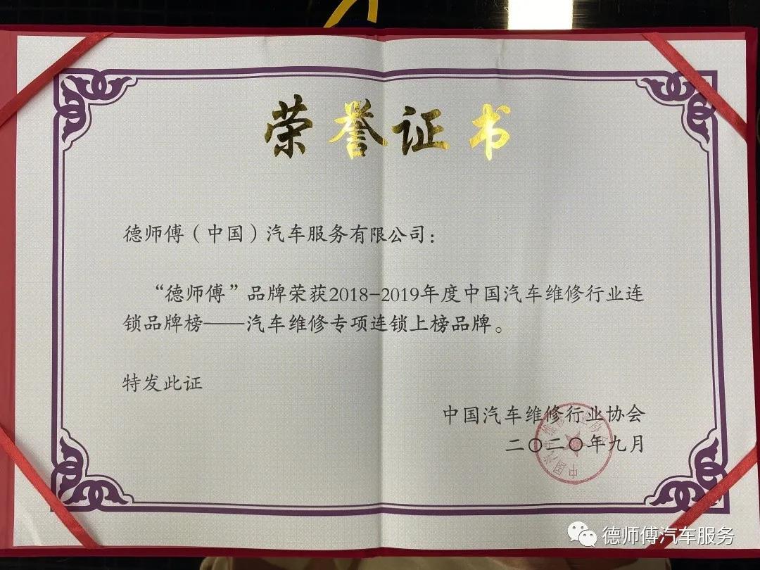 2020年10月16日,德师傅在中国汽车维修行业协会主办的“车店无忧杯”第二届 “中国影响力-中国汽车维修行业连锁品牌榜”榜单发布典礼中荣获“车店无忧杯”中国汽车维修行业连锁品牌榜“汽车维修专项连锁上榜品牌”!