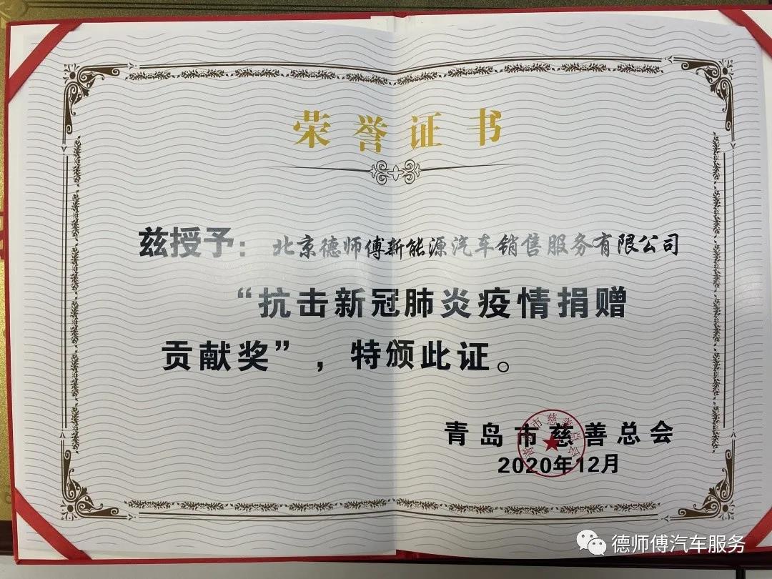 此次青岛市慈善总会为德师傅颁发抗击疫情“捐赠贡献奖”。是对德师傅的鼓励,也是对德师傅的鞭策,献一份爱心、尽一份责任,德师傅将继续为战胜疫情而努力。德师傅希望能尽自己的绵薄之力,为行业及社会鼓舞信心,坚定信念传递汽车行业正能量,用点滴爱心集聚起支援疫情防控的强大正能量,助国家早日打赢这场防疫阻击战。